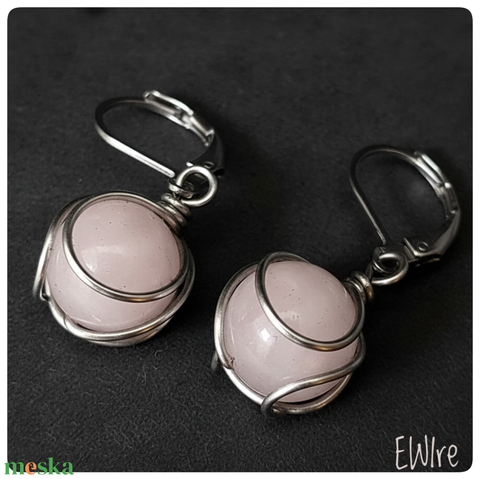 Rózsakvarc fülbevaló, Orvosi fém fülbevaló, drótékszer, ásványgolyós fülbevaló