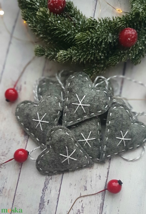 Hímzett karácsonyi ajándékkísérő filc szívek, szürke