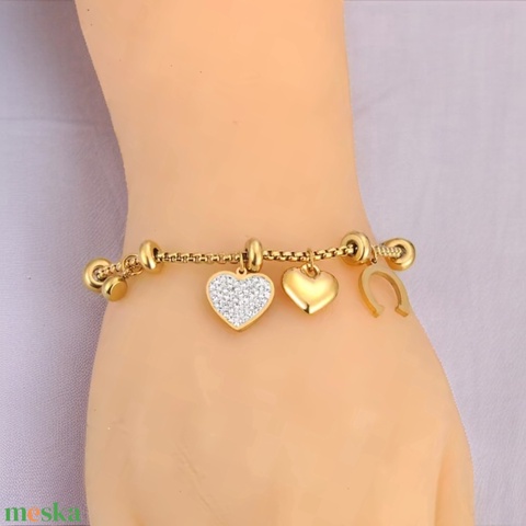 Elegáns aranyszínű nemesacél charm karkötő szív és patkó charmokkal