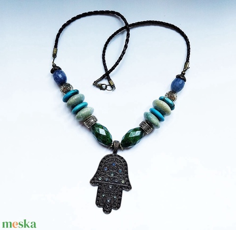 - Anyaga: fém köztes, ásványgyöngyök, delfinkapocs, fém medál, bőrszál