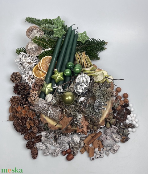 188 darabos, faszelet alapra tervezett DIY adventi koszorú szett fenyőzöld szálgyertyákkal (X-10)