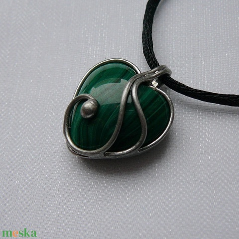 A medál tiffany technikával készült malachit és ólommentes, ezüsttartalmú ón felhasználásával. A díszítés szintén saját készítésű, nem tartalmaz gyári elemeket. A fémrészt óezüstre patináztam, lekezeltem antioxidánssal és lelakkoztam, hogy sokáig szép maradjon.