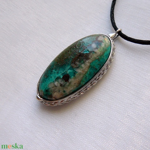 A medál Tiffany technikával készült krizokolla és ólommentes, ezüsttartalmú ón felhasználásával. A díszítés szintén saját készítésű, nem tartalmaz gyári elemeket. A fémrészt óezüstre patináztam és lelakkoztam, hogy sokáig szép maradjon.