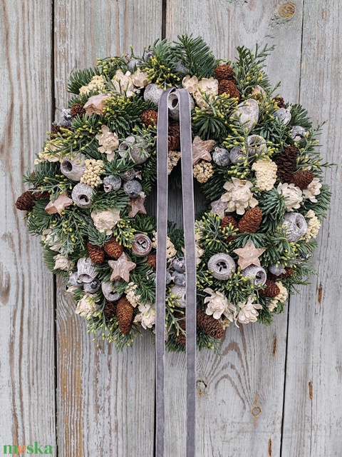 - Anyaga: nobilis fenyő, tuja, achillea, éger termés, hamvas bogyó, eukaliptusz termés, kókusz csillag, bársony szalag