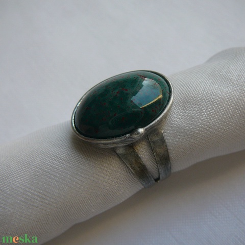 A gyűrű Tiffany technikával készült heliotróp és ólommentes, ezüsttartalmú ón felhasználásával. A díszítés szintén saját készítésű, nem tartalmaz gyári elemeket. A fémrészt óezüstre patináztam és lelakoztam, hogy sokáig szép maradjon.