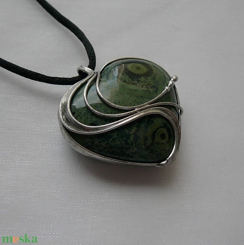 A medál Tiffany technikával készült eldarit - kambaba jáspis és ólommentes, ezüsttartalmú ón felhasználásával. A díszítés szintén saját készítésű, nem tartalmaz gyári elemeket. A fémrészt óezüstre patináztam, lekezeltem antioxidánssal és lelakkoztam, hogy sokáig szép maradjon.