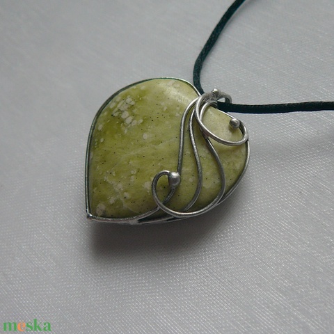 A medál tiffany technikával készült szerpentin és ólommentes, ezüsttartalmú ón felhasználásával. A díszítés szintén saját készítésű, nem tartalmaz gyári elemeket. A fémrészt lekezeltem antioxidánssal és lelakkoztam, hogy sokáig szép maradjon.