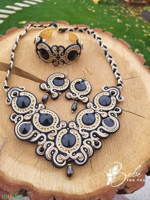 Omega fekete- bézs kézműves sujtás ékszerszett karpereccel