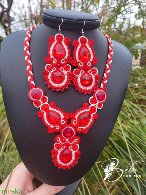 Tűzrőlpattant piros- törtfehér gyöngycsipkézett kézműves sujtás ékszerszett