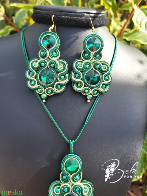 Habcsók petrolzöld- arany kézműves sujtás ékszerszett
