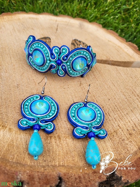 Türkiz- kék- ezüst kézműves sujtás ékszerszett karpereccel