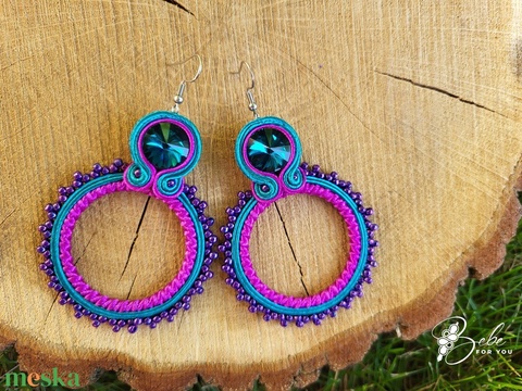 Türkiz- padlizsán karika gyöngycsipkézett kézműves sujtás fülbevaló