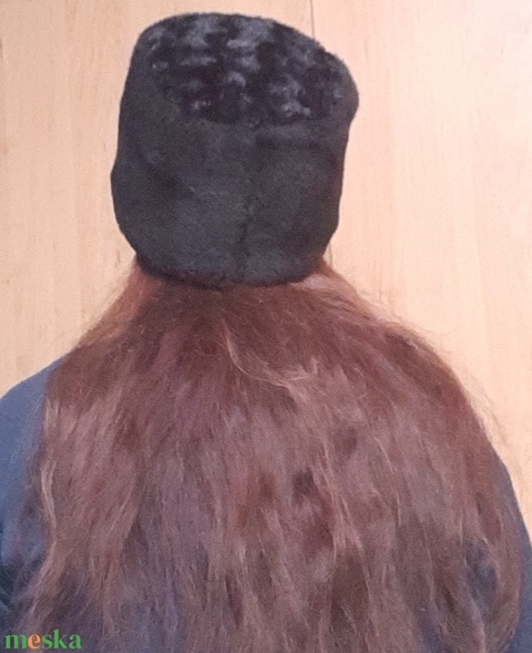 Műszőrméből varrtam a téli sapkát. Az oldala nagyon sötétbarna színű, a tetejét fekete szőrmés anyagból varrtam. A 2. képen látszik a különbség.