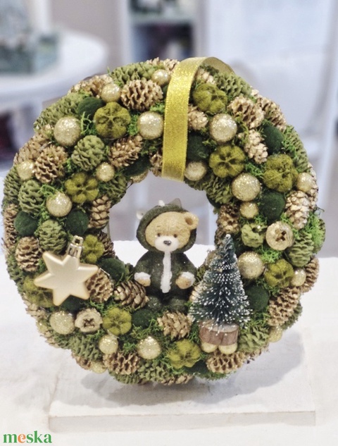 Zöld-arany elegáns macis karácsonyi ajtódísz