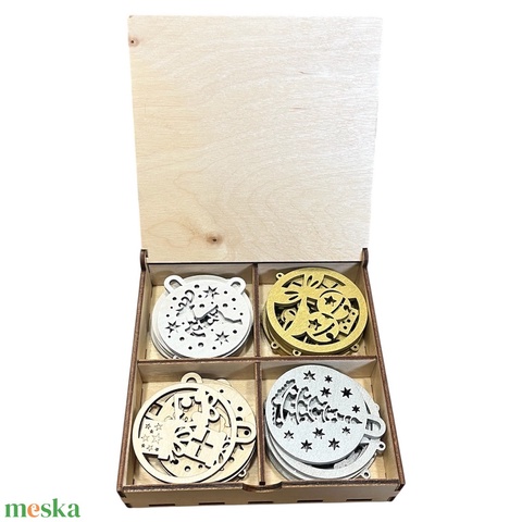 Karácsonyfadísz szett közepes díszdobozban – 24 db fa dísz