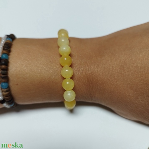 Sárga jáde ásványgyöngy karkötő, a tartósság érdekében négyszeres szilikongumira fűzve.
