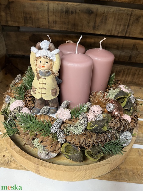 - Anyaga: szárított termések, gyertya, müfenyő, gömbök, fatál