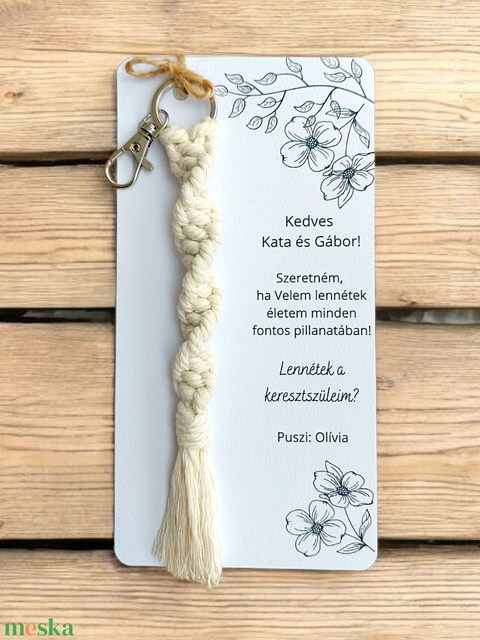 Keresztszülő felkérő ajandék - egyedi csavart makramé kulcstartó - krém