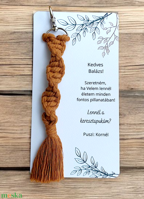 Keresztszülő felkérő ajándék- egyedi csavart makramé kulcstartó barna