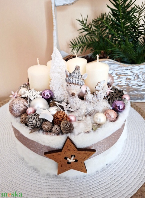 Őzikés adventi doboz, gyertyadísz, adventi asztali dísz bézs-púder