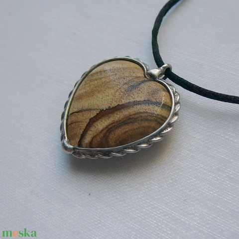 A medál Tiffany technikával készült képjáspis és ólommentes, ezüsttartalmú ón felhasználásával. A díszítés szintén saját készítésű, nem tartalmaz gyári elemeket. A fémrészt óezüstre patináztam, lekezeltem antioxidánssal és lelakkoztam, hogy sokáig szép maradjon.