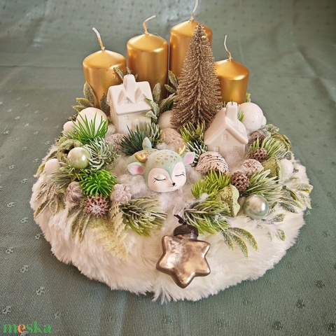 Adventi koszorú szőrme alapon, arany színű gyertyákkal