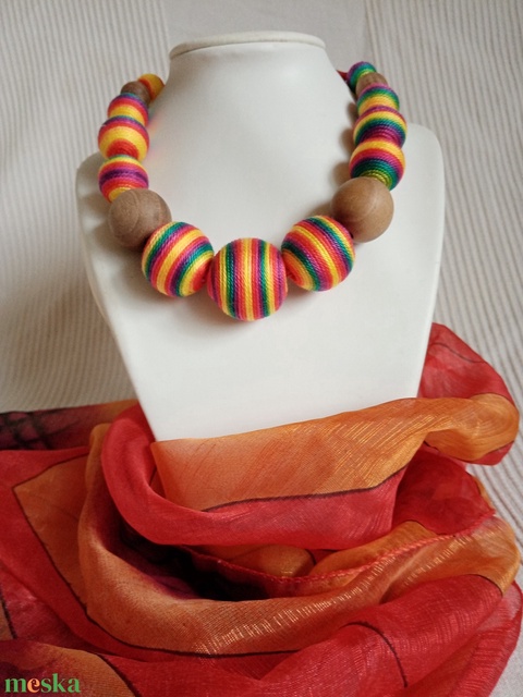 Szivárvány textilbogyó nyaklánc, fonal nyaklánc, golyó nyaklánc