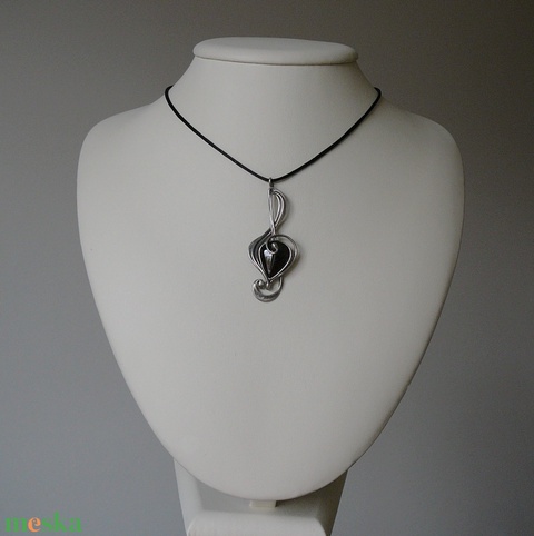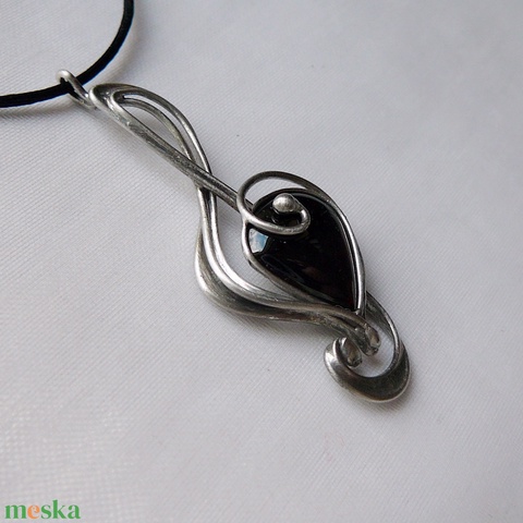 A medál tiffany technikával készült gránát és ólommentes, ezüsttartalmú ón felhasználásával. A díszítés szintén saját készítésű, nem tartalmaz gyári elemeket. A fémrészt óezüstre patináztam, lekezeltem antioxidánssal és lelakkoztam, hogy sokáig szép maradjon. 45 cm hosszú, nikkelmentes zárral ellátott szaténzsinórra akasztottam. A zsinór hosszát igény szerint alakítom