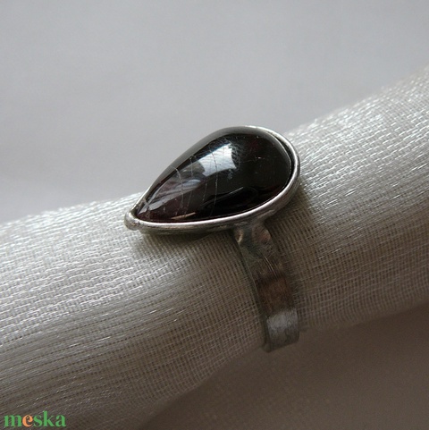 A gyűrű Tiffany technikával készült gránát és ólommentes, ezüsttartalmú ón felhasználásával. A díszítés szintén saját készítésű, nem tartalmaz gyári elemeket. A fémrészt óezüstre patináztam, lekezeltem antioxidánssal és lelakoztam, hogy sokáig szép maradjon.