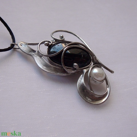A medál Tiffany technikával készült fekete turmalin ( sörl ) és ólommentes, ezüsttartalmú ón felhasználásával. A díszítés szintén saját készítésű, nem tartalmaz gyári elemeket. A fémrészt óezüstre patináztam, lekezeltem antioxidánssal és lelakkoztam, hogy sokáig szép maradjon.