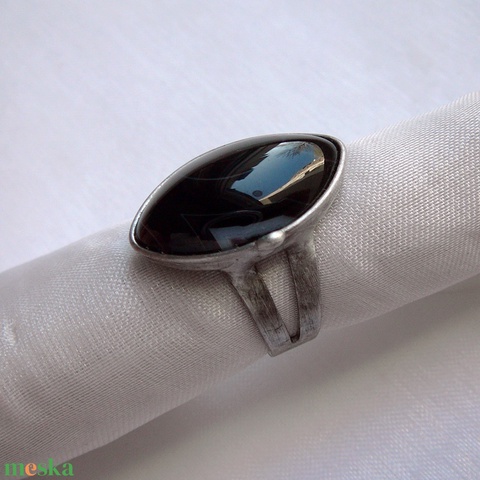 A gyűrű Tiffany technikával készült ónix és ólommentes, ezüsttartalmú ón felhasználásával. A díszítés szintén saját készítésű, nem tartalmaz gyári elemeket. A fémrészt óezüstre patináztam, lekezeltem antioxidánssal és lelakoztam, hogy sokáig szép maradjon.