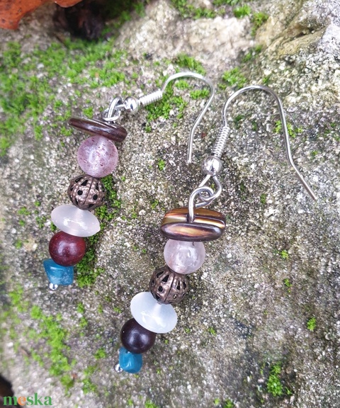 - Anyaga: bronz csipkés golyó, nikkelmentes akasztó, kagylóhély barna, hilulit, kiazonit, rózsafa, achat