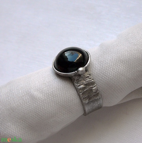 A gyűrű Tiffany technikával készült ónix és ólommentes, ezüsttartalmú ón felhasználásával. A díszítés szintén saját készítésű, nem tartalmaz gyári elemeket. A fémrészt óezüstre patináztam, lekezeltem antioxidánssal és lelakoztam, hogy sokáig szép maradjon.