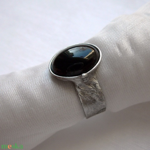 A gyűrű Tiffany technikával készült ónix és ólommentes, ezüsttartalmú ón felhasználásával. A díszítés szintén saját készítésű, nem tartalmaz gyári elemeket. A fémrészt óezüstre patináztam, lekezeltem antioxidánssal és lelakoztam, hogy sokáig szép maradjon.