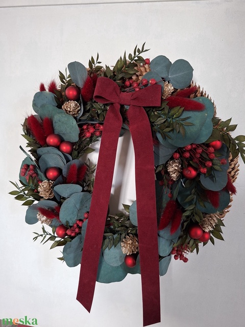 - Anyaga: szalmakoszorú, toboz, termések, üveggömb, tartosítotteukaliptusz, ruszkusz