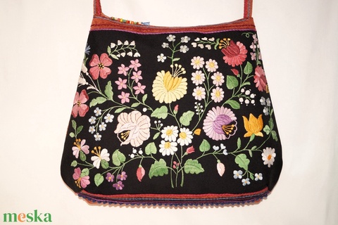 Fekete, kézzel hímzett, pasztel virágos hímzett textíliából készült, nagy méretű egyedi női pakolós cipzáros válltáska