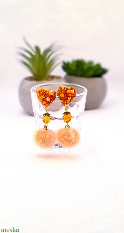 Narancssárga gyöngyös, nyuszi pom-pom-os fülbevaló.