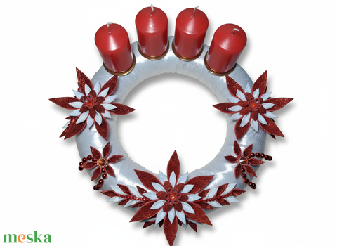 Adventi koszorú csillámos dekorgumi virágokkal, gyertyákkal.Fehér-piros
