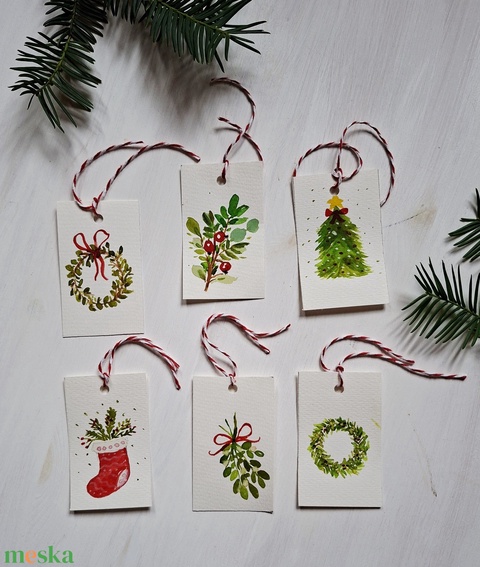 Karácsonyi zöldek- 6db- kézzel festett karácsonyi ajándékkísérő, dekoráció