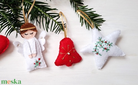 Karácsonyi hímzett filc díszek-4db angyal, csillag, csengő, szív