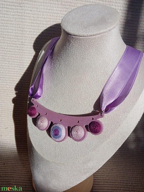 Lila faalapra fonaldíszítéssel készült nyaklánc, textilékszer, faékszer