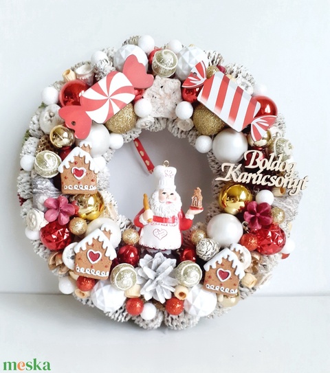 koszorú alap, termések, karácsonyi gömbök, figura, felirat