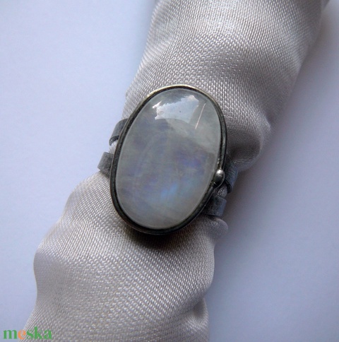 A gyűrű tiffany technikával készült holdkő és ólommentes, ezüsttartalmú ón felhasználásával. A díszítés szintén saját készítésű, nem tartalmaz gyári elemeket. A fémrészt óezüstre patináztam, lekezeltem antioxidánssal és lelakkoztam, hogy sokáig szép maradjon.