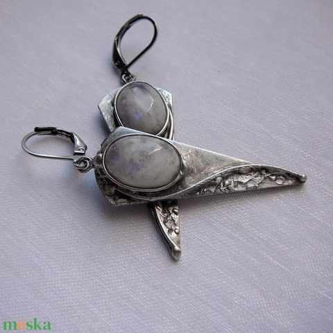 A fülbevaló Tiffany technikával készült holdkő és ólommentes, ezüsttartalmú ón felhasználásával. A díszítés szintén saját készítésű, nem tartalmaz gyári elemeket. A fémrészt óezüstre patináztam és lelakkoztam, hogy sokáig szép maradjon.