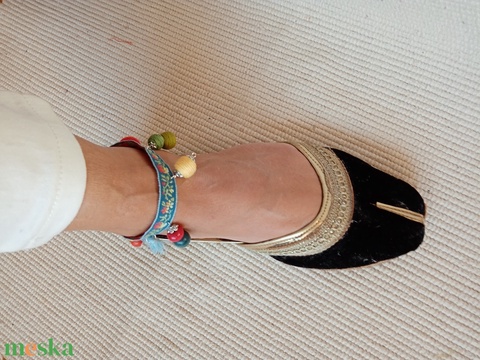 Kék virágos alapon színes bokalánc, textilbogyó bokalánc, bokaékszer, lábdísz, lábékszer