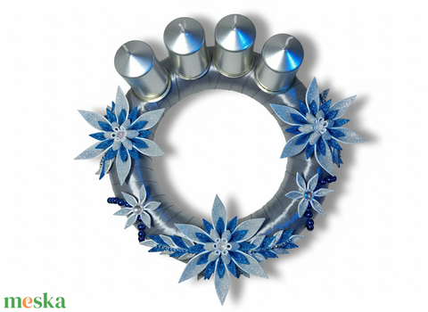 Adventi koszorú csillámos dekorgumi virágokkal, gyertyákkal. Ezüst-kék