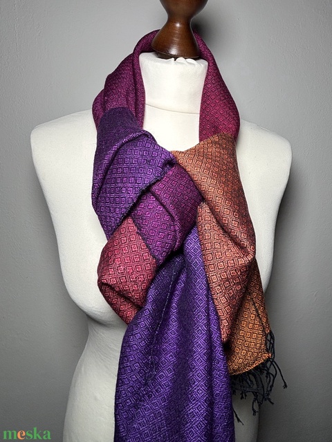 Kézzel szőtt Lila Narancs Selyem és Merinó Kendő