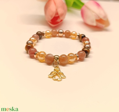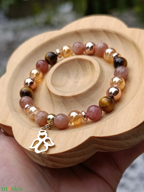 - Anyaga: gumis damil, barack holdkő, arany aura kvarc, tigrisszem, eperkvarc, hematit