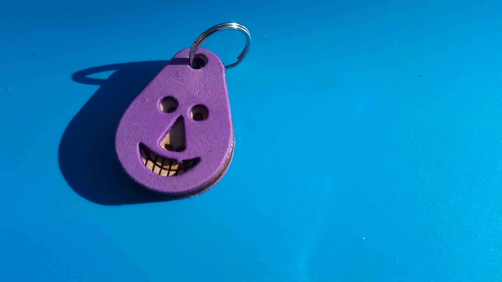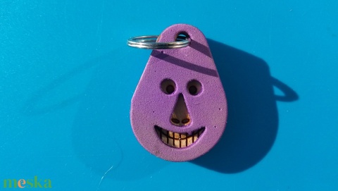 Lila, "Vidám Busó" kulcstartó. Gumírozott felület, gravírozott alappal. Vidámaknak jár, búsulóknak vidító ajándék.
