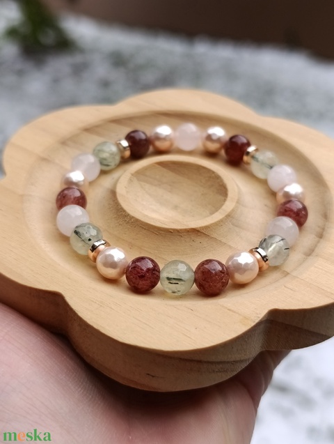 "Ölelés" ásványkarkötő prehnittel, eperkvarccal, rózsakvarccal és kagylóhéjjal